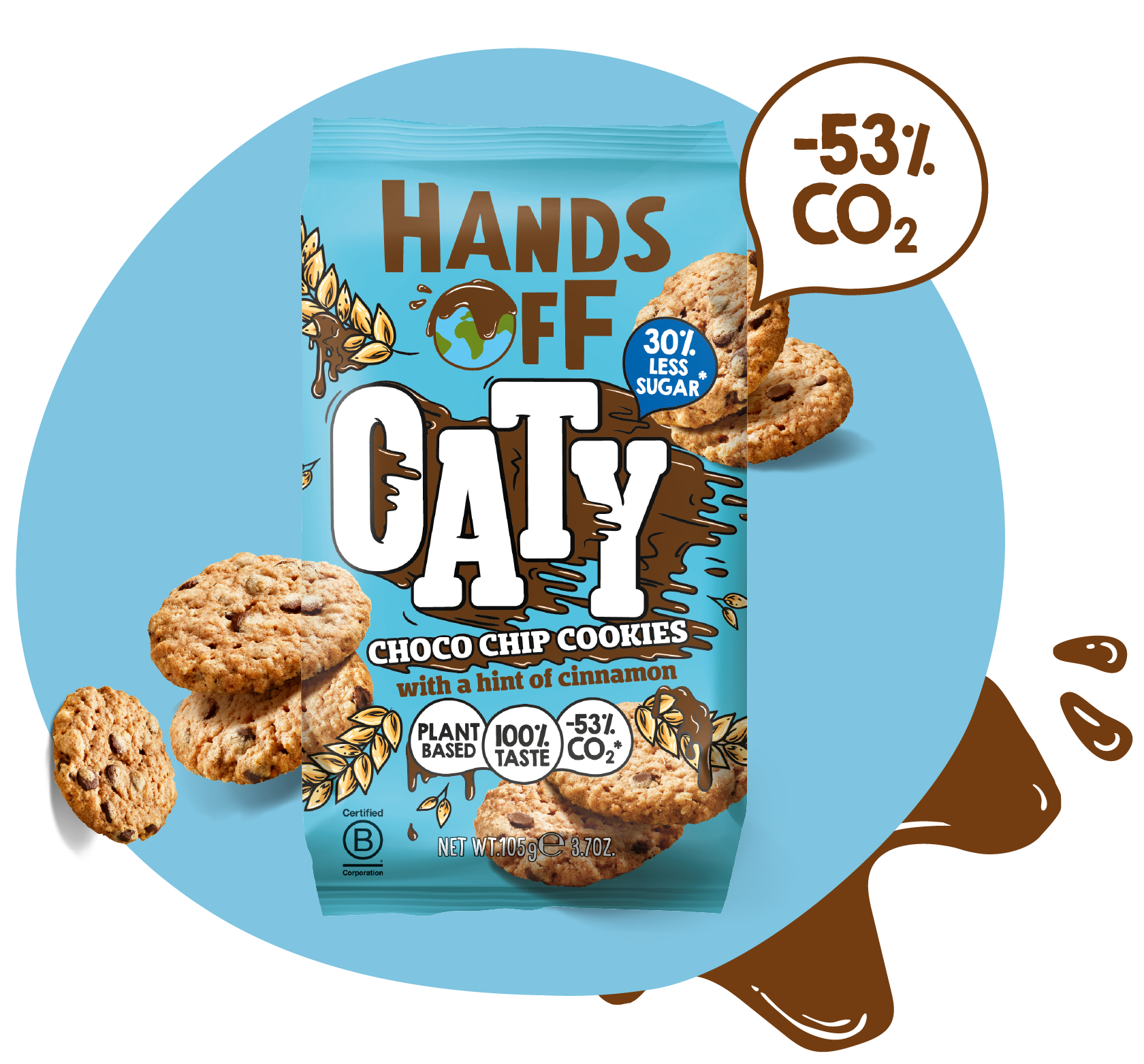 Hands Off Choco Chip Oaty Cookies 30% less sugar. These cookies contain 30% less sugar than regular choco chip cookies and taste just as delicious! They’re 100% plant-based, made with oats for extra fiber, and have a hint of cinnamon for that naturally amazing flavor.