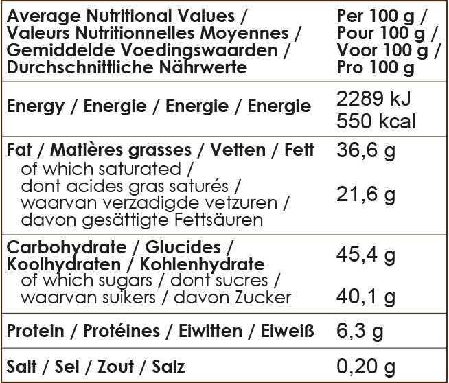 成分:可可液塊°、未精製蔗糖°、可可脂°、杏仁片° (2.2%)、葵花籽° (1.3%)、爆米花° (1.3%)、藜麥° (1, 3%)、南瓜籽(pepitas)° (1%)、海鹽(0,2%)、枸杞子° (0,2%)、天然香草調味料°。