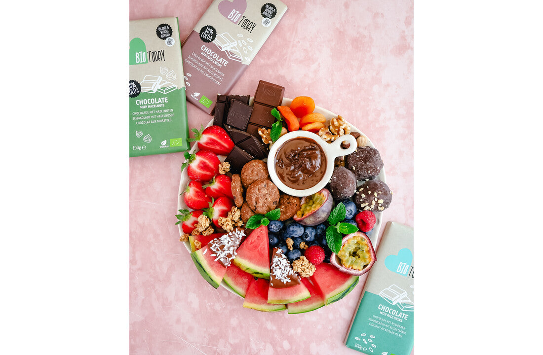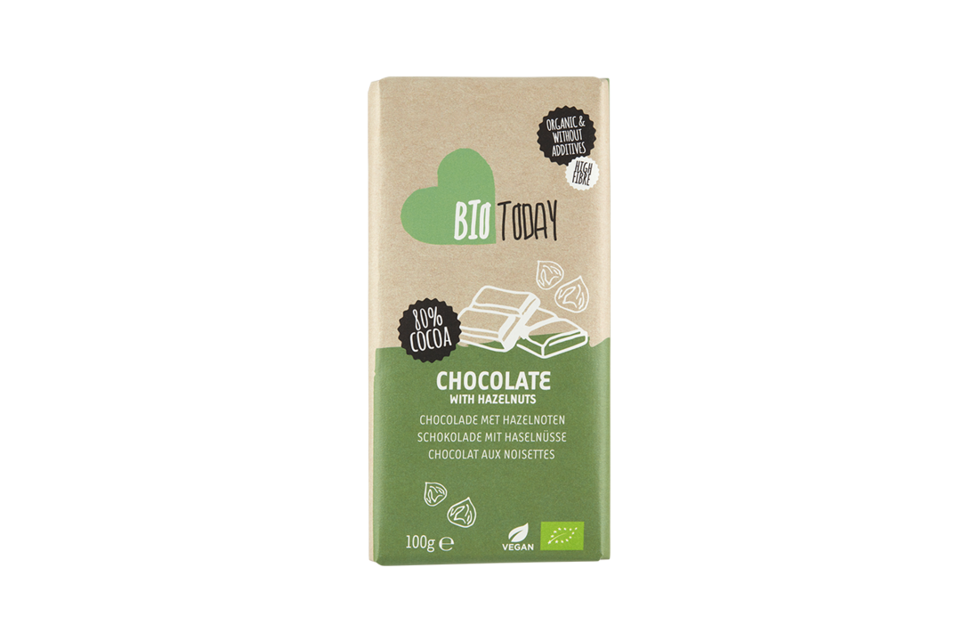 BioToday 有機巧克力棒榛果。 BioToday 的巧克力棒由含有至少 80% 可可固體的黑巧克力製成。因此,它們不含牛奶或奶粉,因此這些能量棒都是純素的。此外,這些巧克力棒不含人工香料、色素和香料,並且 100% 有機。這使得這些巧克力棒成為巧克力領域的永續選擇。