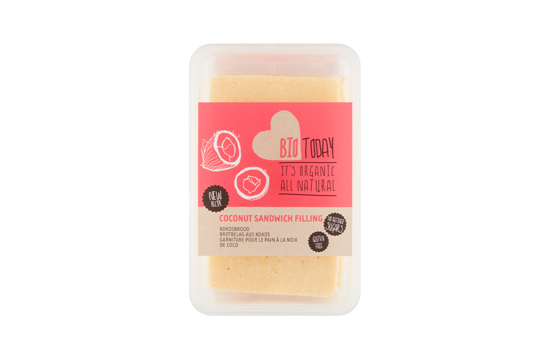 BioToday 有機椰子三明治餡料。無麩質椰子麵包是麵包或餅乾的美味甜味配料,不添加人工香料、色素和香料。椰子麵包作為零食或裝飾烘焙作品也很美味。麵包的底料由椰子、糖漿以及來自蘋果和梨的天然甜味劑組成。