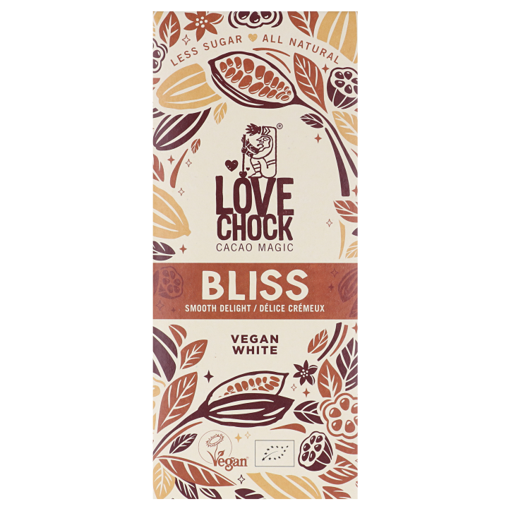 Lovechock 生滑白巧克力極樂少糖。幸福的酒吧!用純素白巧克力滿足您的味蕾。採用米奶粉和菊粉精製而成,菊粉作為額外的風味載體,巧克力的美妙香氣在您的舌頭和靈魂中展開。