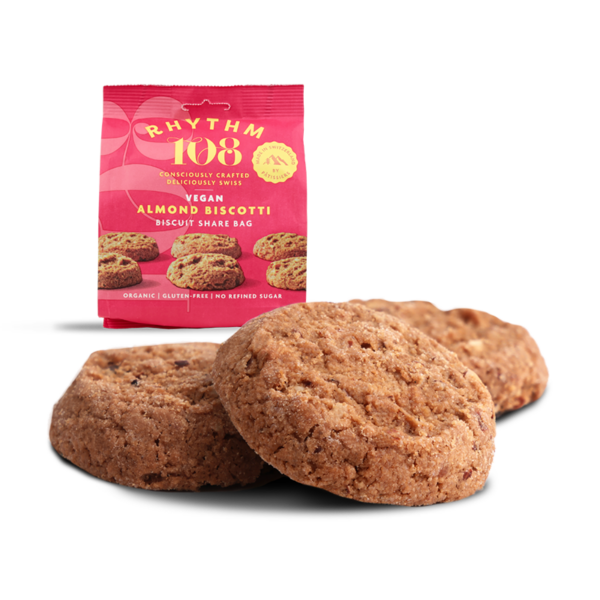 Rhythmn 108 有機、無麩質、無塑膠、無棕櫚油。我們的義大利風味杏仁脆餅裝滿了杏仁片,並用純椰子油烘烤,無需黃油即可產生“黃油”脆脆感。這些純素、有機和無麩質餅乾由專業的瑞士糕點師製作,每包約 16 塊餅乾,我們的共享袋非常適合與家人和朋友一起享用一杯茶或咖啡。