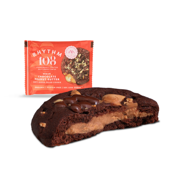 Rhythm108 有機、無麩質、無塑膠、無棕櫚油。我們的巧克力花生醬軟烤餅乾是一款濃鬱的巧克力餅乾,裡面充滿了光滑、黏稠的花生醬,上面撒有烤花生和迷你巧克力片。完美的甜味和一絲鹹味。每塊餅乾都是在我們位於阿爾卑斯山腳下的瑞士小麵包店慢慢手工製作的。