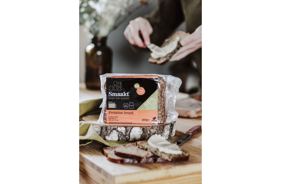 Smaakt 有機蛋白麵包,低碳水化合物。 Smaakt蛋白麵包採用全麥黑麥製成,富含膳食纖維和蛋白質。麵包片質地緊實,100% 有機,低碳水化合物,不含人工添加劑和精製糖。非常適合早餐、午餐或兩餐之間享用。搭配(蔬菜)醬、新鮮番茄和黃瓜等食物,美味無比。