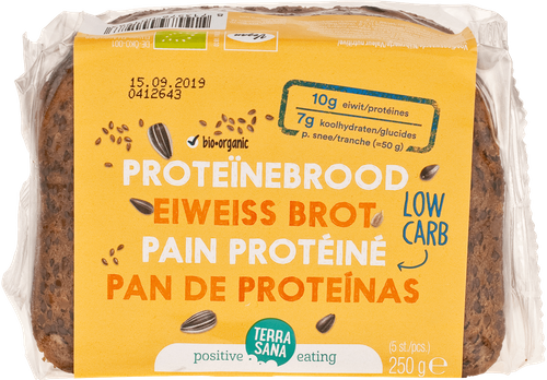 Terrasana 有機蛋白質麵包。你喜歡吃更多的蛋白質和更少的碳水化合物嗎?這種蛋白質麵包是天賜之物。每片含有 10 克蛋白質和 7 克碳水化合物。非常堅固,同時又非常有彈性!這種蛋白質麵包可能是有史以來最通用的麵包。由獨特的黑麥、小麥蛋白和大豆製成。蛋白質含量高(每 100 克 20 克),碳水化合物含量低(每 100 克 14 克,而不是普通麵包的 40 克)。麵包的結構堅硬但有彈性。適合活躍人士和任何遵循蛋白質飲食的人的超級美味午餐或小吃。