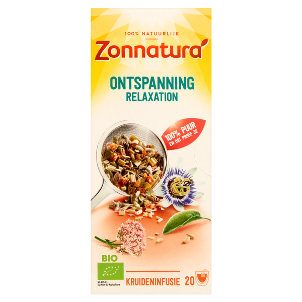 Zonnatura 有機放鬆。 Zonnatura Relaxation 是一種僅以純有機草藥製成的茶。它是一種草本混合物,其中包括西番蓮、檸檬香脂和薰衣草。一種芬芳可口的茶,您可以在放鬆的時刻享用。有機茶適合多樣化的飲食和健康的生活方式。